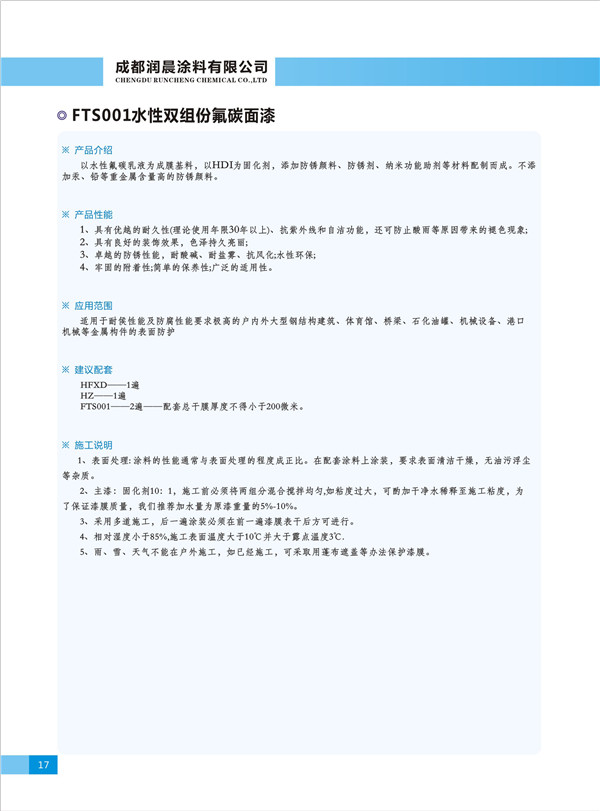 簡介—— 以水性氟碳乳液為成膜基料,以HDI為固化劑,添加防銹顏料、防銹劑、納米功能助劑等材料配制而成。不添加汞、鉛等重金屬含量高