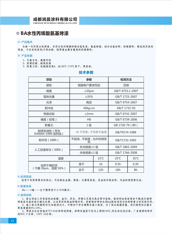 簡介—— 為新一代環(huán)保水性烤漆,采用水性丙烯酸防銹功能乳液、氨基樹脂、納米功能材料、防銹顏料、緩蝕劑及助劑制備,不含有機溶劑;不添