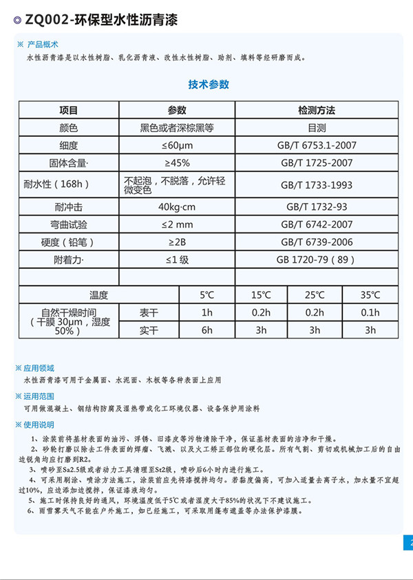 簡(jiǎn)介—— 水性瀝青漆是以水性樹脂、乳化瀝青液、改性水性樹脂、助劑、填料等經(jīng)研磨而成。