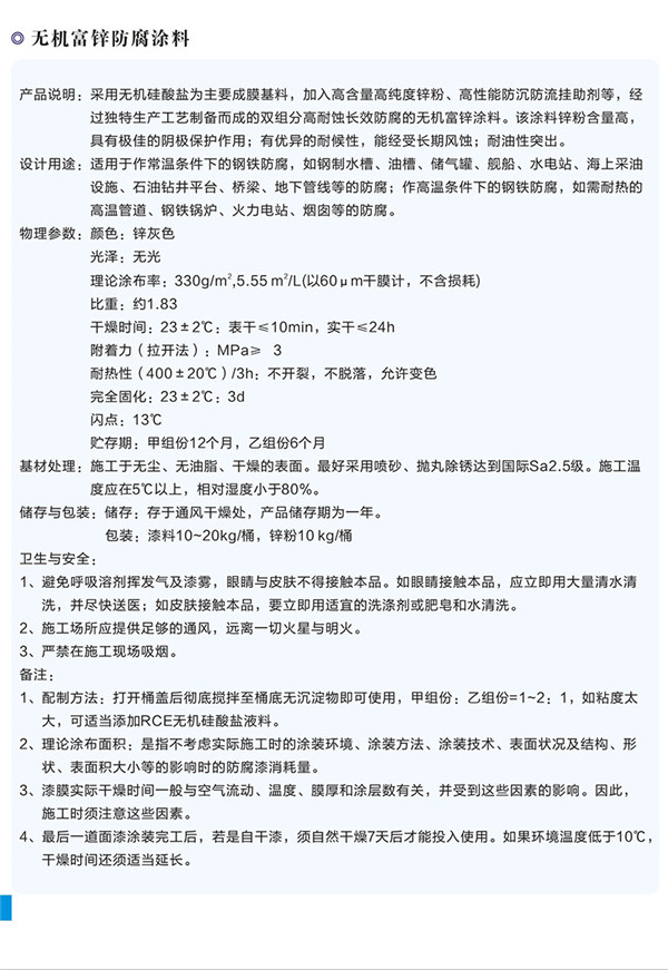 簡介—— 產(chǎn)品說明:采用無機硅酸鹽為主要成膜基料,加入高含量高純度鋅粉、高性能防沉防流掛助劑等,經(jīng)過獨特生產(chǎn)工藝制備而成的雙組分高
