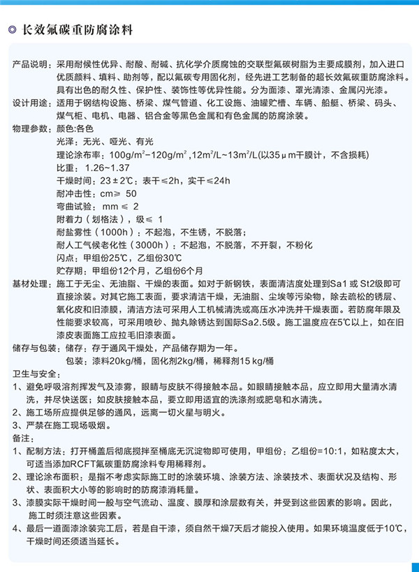 簡(jiǎn)介—— 產(chǎn)品說明:采用耐候性優(yōu)異、耐酸、耐堿、抗化學(xué)介質(zhì)腐蝕的交聯(lián)型氟碳樹脂為主要成膜劑,加入進(jìn)口顏料、填料、助劑等,配以氟碳專