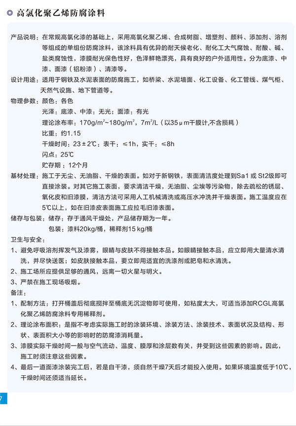 簡介—— 產(chǎn)品說明:在常規(guī)高氯化漆的基礎(chǔ)上,采用高氯化聚乙烯、合成樹脂、增塑劑、顏料、添加劑、溶劑等組成的單組份防腐涂料,該涂料具