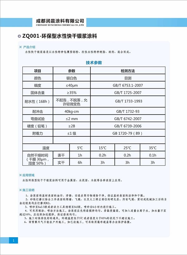 簡(jiǎn)介—— 水性快干銀漿漆是以水性特種包覆型鋁粉、改性水性特種樹脂、助劑、混合而成.