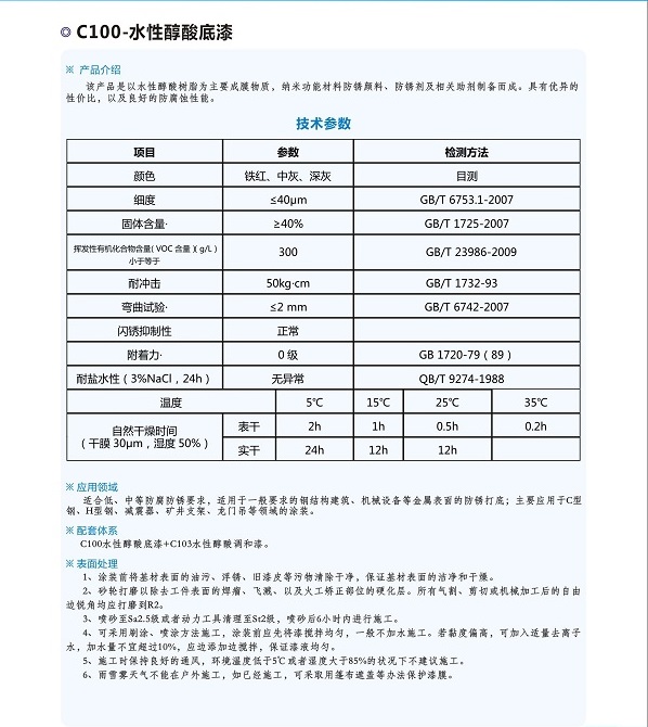 簡介—— 該產(chǎn)品是以水性醇酸樹脂為主要成膜物質(zhì),納米功能材料防銹顏料、防銹劑及相關(guān)助劑制備而成,具有優(yōu)異的性價比,以及良好的防腐蝕