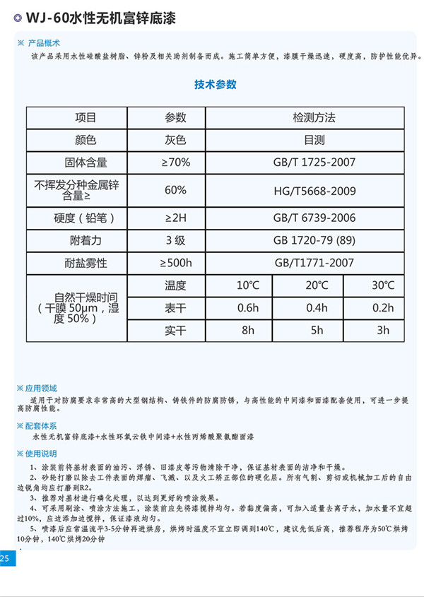 簡介—— 該產(chǎn)品采用水性硅酸鹽樹脂、鋅粉及相關(guān)助劑制備而成。施工簡單方便,漆膜干燥迅速,硬度高,防護(hù)性能優(yōu)異。